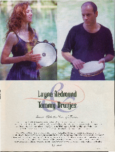 “On their first recording for their artist-owned label, frame drum virtuosi Layne Redmond and Tommy Brunjes provide a straightforward showcase of their trancy, hypnotic musicianship. This is lean, muscular playing, percussion that throbs and whirls like a belly dancer in ecstasy. Stylistically, the artists are continuing their project of creating a truly new language for hand drums, drawing on various world instruments (and styles) to give birth to a modern, "American" school of drumming. One important element for this, like all of Layne's previous recordings, is the listener's own consciousness -- for this is music meant not merely to entertain, but to transform, exploiting the drum's mind-altering abilities to invoke a sacred energy of heightened awareness.” Carl McColmen